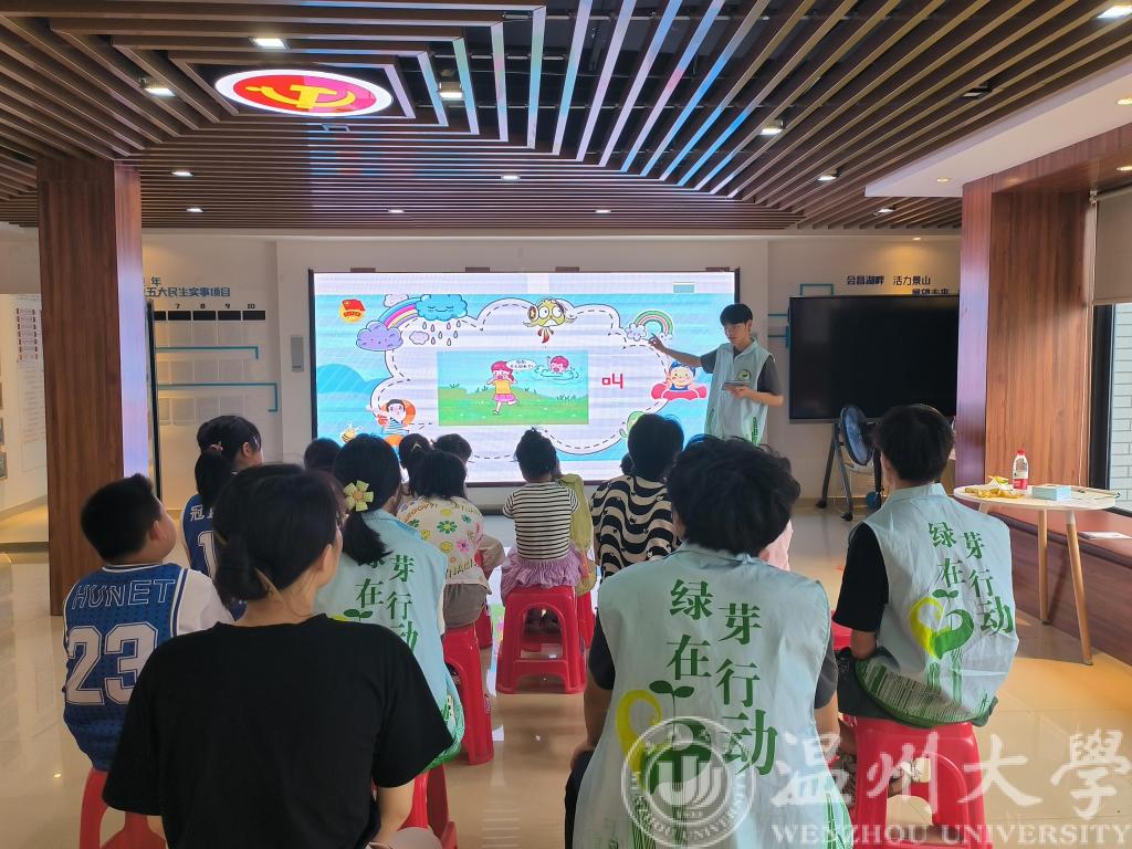 据悉,为推进引导和帮助广大青年学生上好与现实相结合的“大思政课”,在社会课堂中受教育、长才干、作贡献,在观察实践中坚定信念听党话、跟党走,2023年暑假温州大学指导在校大学生开展了“双百双千”行动专项团队、美育乡村暑期社会实践队、创新专项团队和“防溺水”专项示范团队等近百余只暑期实践队伍,5000多名大学生前往温州的各个县(市、区)开展暑期社会实践活动,英国正版365官方网站绿芽暑期社会实践队就是其中一支。英国正版365官方网站绿芽暑期社会实践队秉持着“守护绿城,呵护芽心”的实践宗旨,深入社区,以环保知识宣讲、防溺水安全教育、环保小游戏、手工DIY等方式开展暑期社会实践活动,旨在为孩子播下一颗绿色的种子,呵护新芽的成长。