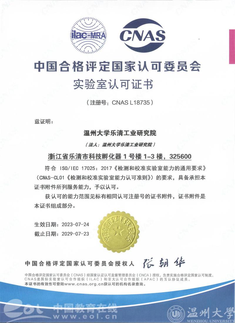 2023年7月,温州大学乐清工业研究院喜获CNAS、CMA证书,助力电气产业产品研发测试创新能力提升!